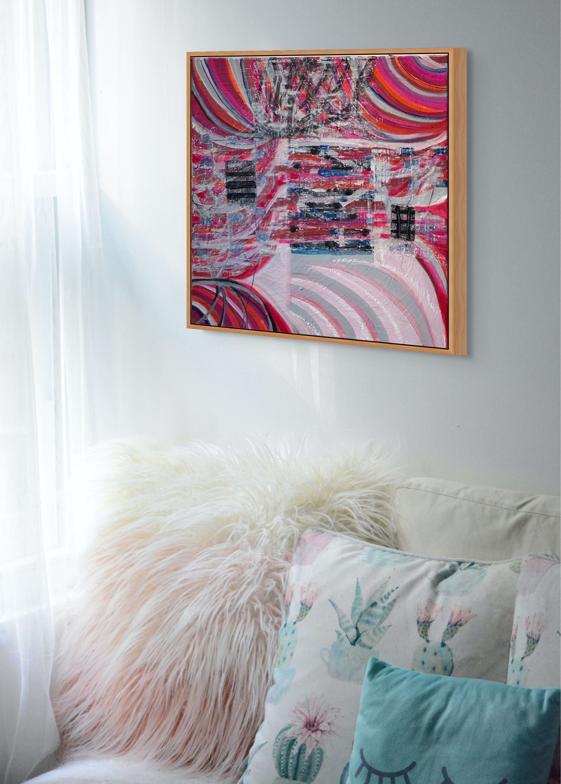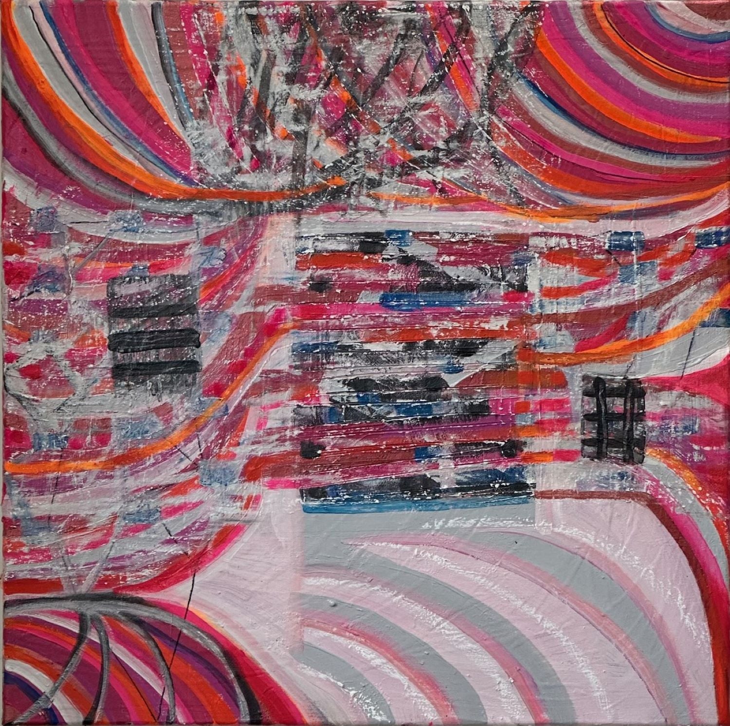 Acrylic and oil pastel on 62cm x 62cm canvas.